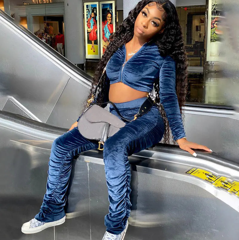 The set includes a stylish long sleeve hooded crop top that pairs perfectly with slim pencil pants, creating a sleek silhouette that highlights your shape. With popular features like a zipper and hood, this outfit is both functional and fashionable.