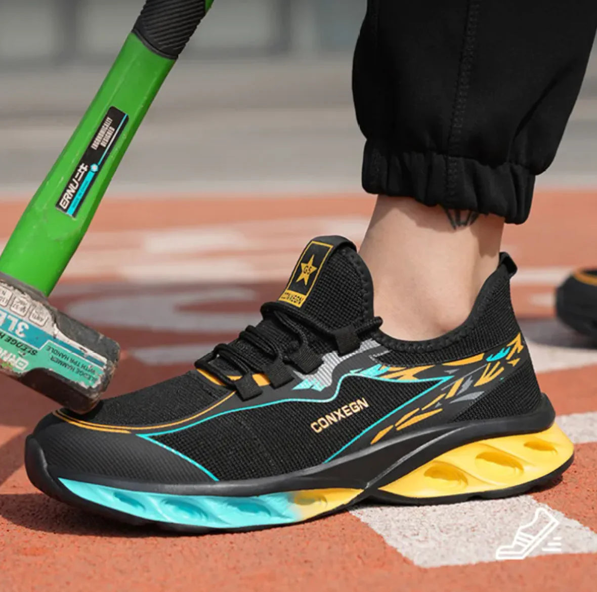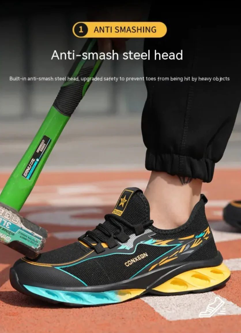 Stay protected without sacrificing comfort with these breathable, ultra-light steel toe shoes. Designed for smash resistance and anti-penetration, they feature a reinforced steel toe cap and a durable EVA sole for superior safety. The flyknit upper ensures maximum airflow, keeping your feet cool during long hours. Ideal for construction, logistics, auto repair, and industrial work, these shoes provide secure front lace-up closure and a flexible yet tough build for all-day wear.
